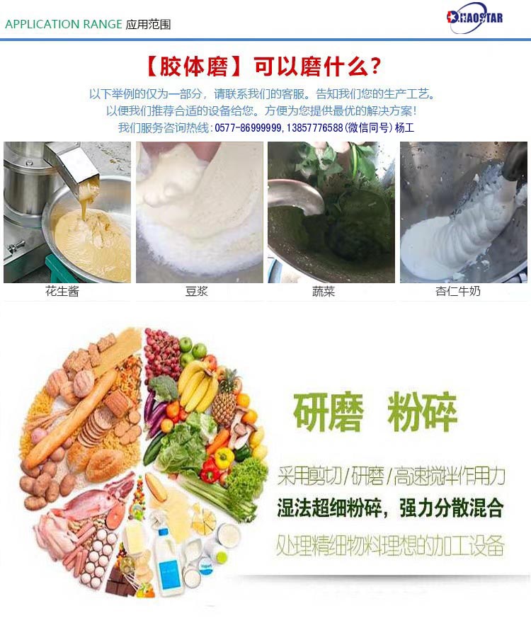 适用于各类液态状介质物料中、小型处理物料粘稠密度应小于300-3000厘泊的介质,中型处理物料粘稠密度应小于10000厘泊的介质,高于15000厘泊(CP)采用180型以上胶体磨应用超大流量的谷物类物料的粉碎作用,对于皮渣类物料的进一步粉碎要求的效果尤为显著。如:辣椒、番茄皮渣、甜玉米、老玉米、大薯、白兰豆、大豆、菠萝、木薯、秸秆、海藻、催化剂、混悬液、煤焦油、重油、乳化混合油、生物、化工、炭黑、白炭黑、钛白粉、麦、饲料、鱼饵、包谷酒糟、白酒糟、啤酒糟、船用垃圾、生活垃极、畜牧垃极、餐厨污水处理、水产品废料等.。