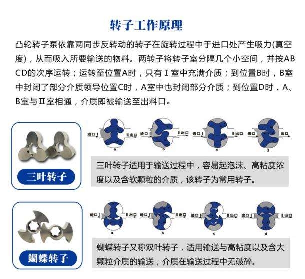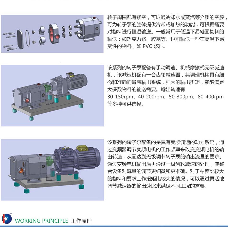 转子泵采用的二叶、三叶、碟形、多叶型的转子,是一种多用途的容积式输送泵。它具有转速低、输出扭矩高、耐高温、耐腐蚀等特点,是一种卫生型的容积式输送泵。其独特的工作原理和特点体现在输送高粘度、高温度、高腐蚀性的物料中,其输送过程平稳、连续,并且能够保证物料在输送过程中物理性能不被破坏,可输送物料的粘度,可高达1,000,000CP。