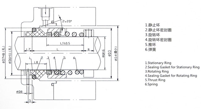 单端面、非平衡型、锥形弹簧传动结构,弹簧另一端并圈锁定在轴上,弹簧旋向与泵轴旋向有关。