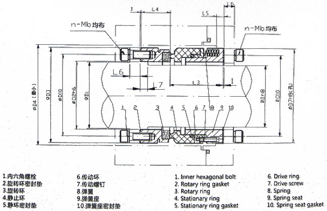 内装、单端面、多弹簧、平衡型、弹簧静止型密封结构。