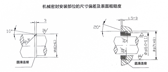 1、与机械密封所配轴和静环座的尺寸公差、表面粗糙度和倒角过渡形状见下图;