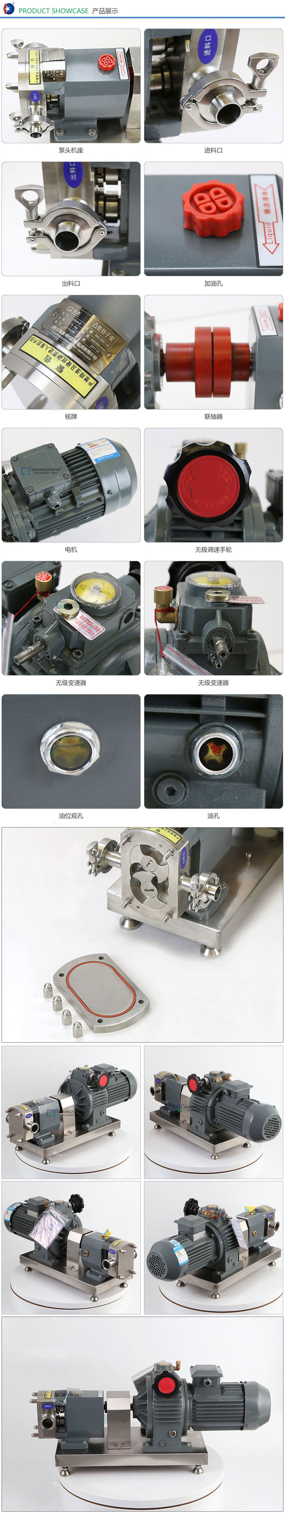 转子泵在工作中不存在任何零件的磨损(除机械密封外),所有与物料接触的零件均为不锈钢制作,一对